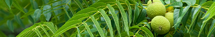 The black walnut is a large deciduous tree attaining heights of 98–131 feet. Under forest competition, it develops a tall, clear trunk; the open-grown form has a short trunk and broad crown. The bark is grey-black and deeply furrowed. The pith of the twigs contains air spaces.The tree tends to crop more heavily in alternate years. Fruiting may begin when the tree is 4–6 years old, however large crops take 20 years. Total lifespan of J. nigra is about 130 years. Black Walnut does not leaf out until late spring when the soil has warmed and all frost danger is past.